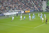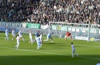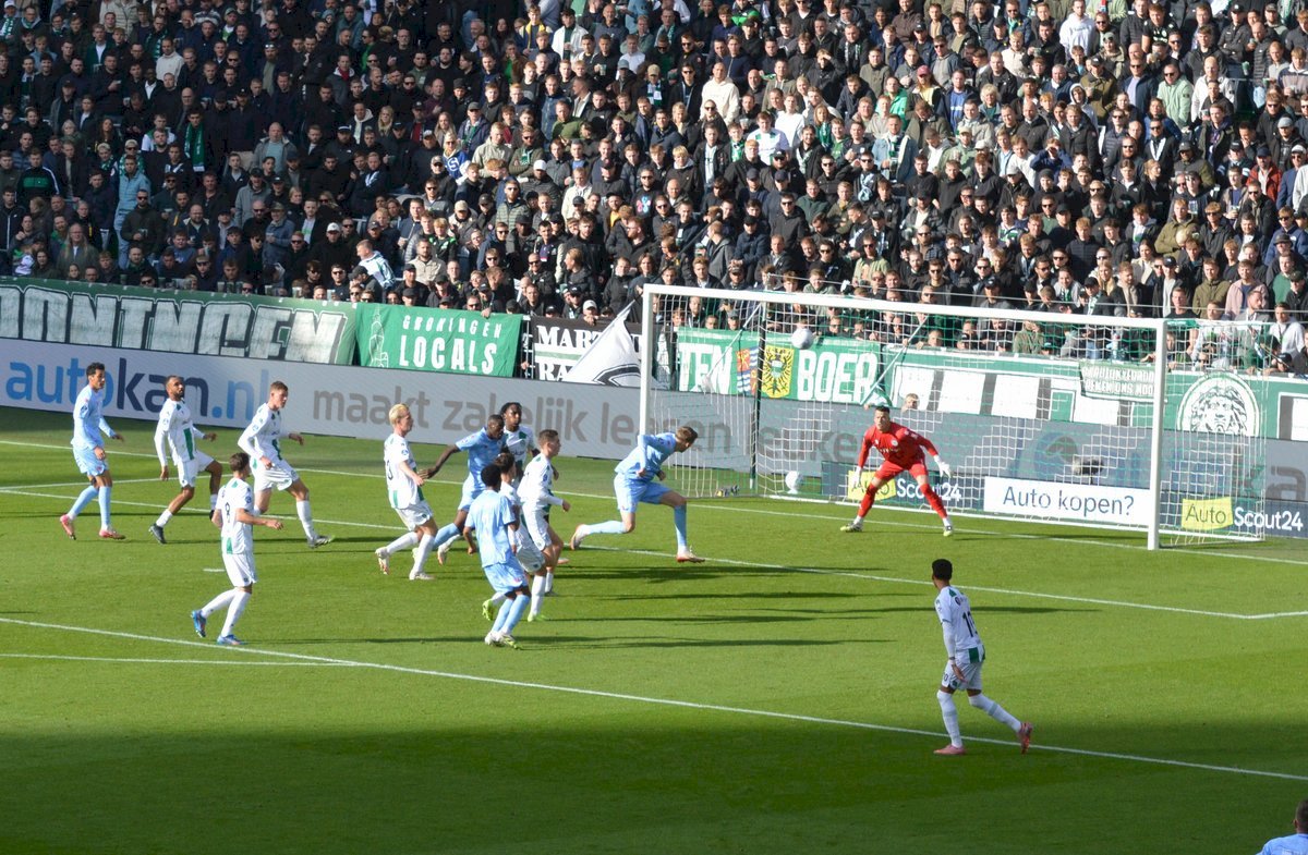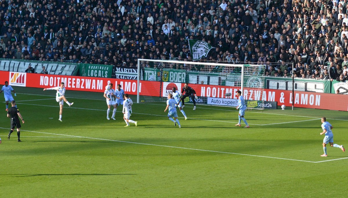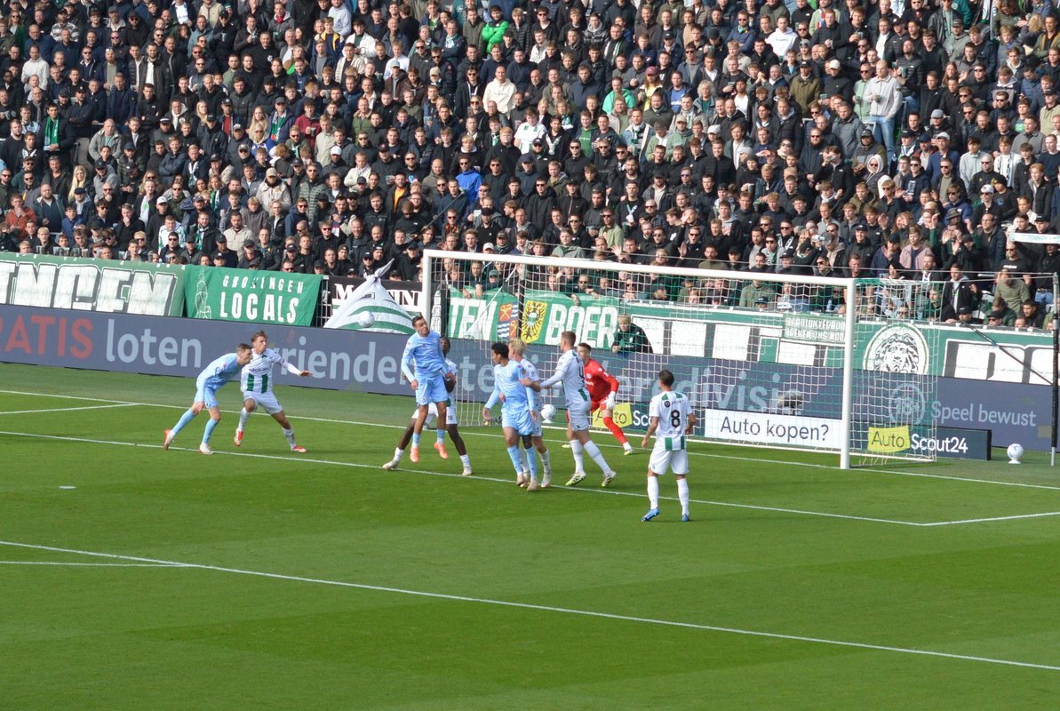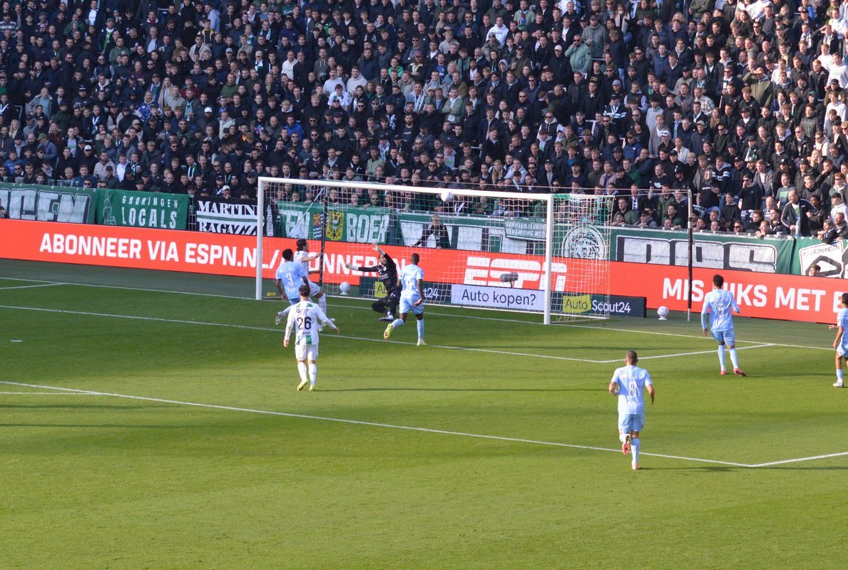 Na precies een kwartier spelen kreeg Sparta een hoekschop te nemen. Ayoub Oufkir bracht de bal op een presenteerblaadje voor Tobias Lauritsen die zijn vijfde doelpunt van het seizoen maakte en Sparta op voorsprong bracht in de Euroborg, 0-1.